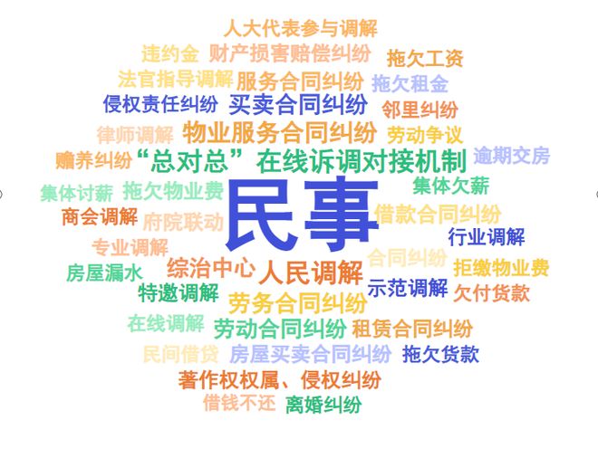 (二)多元解纷案例中“民事”“‘总对总’在线诉调对接机制”“人民调解”关键词出现频次较高