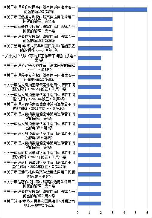 51部司法解释共引用104条司法解释条文,引用次数最多的为《关于审理著作权民事纠纷案件适用法律若干问题的解释》第7条,共引用6次;《关于适用 中华人民共和国民法典 婚姻家庭编的解释(一)》第5条、《关于审理著作权民事纠纷案件适用法律若干问题的解释》第26条和25条、《关于审理侵犯专利权纠纷案件应用法律若干问题的解释》第11条均引用3次;《关于适用 中华人民共和国民法典 时间效力的若干规定》第1条、《关于审理著作权民事纠纷案件适用法律若干问题的解释》第27条及《关于审理涉彩礼纠纷案件适用法律若干问题的规定》第3条等17条司法解释引用次数均为2次。