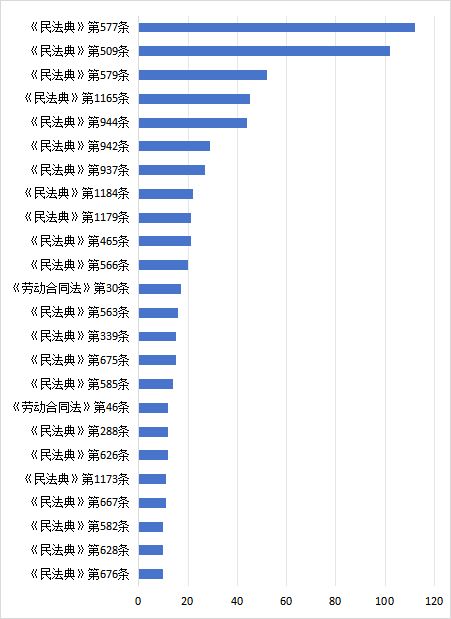 40部实体法共引用425条法律条文,其中引用次数超100次的有2条,依次为《民法典》第577条(承担违约责任的方式)引用112次、第509条(合同履行的原则)引用102次;其次是《民法典》第579条(金钱债务实际履行责任)引用52次、第1165条(过错责任原则)引用45次、第944条(业主支付物业费的义务)引用44次;引用次数在10次至30次之间的有19条,包括《民法典》第942条引用29次、第937次引用27次、第1184条引用22次等。《民法典》第7条、第562条及《劳动法》第50条等401条引用次数均在10次以下。