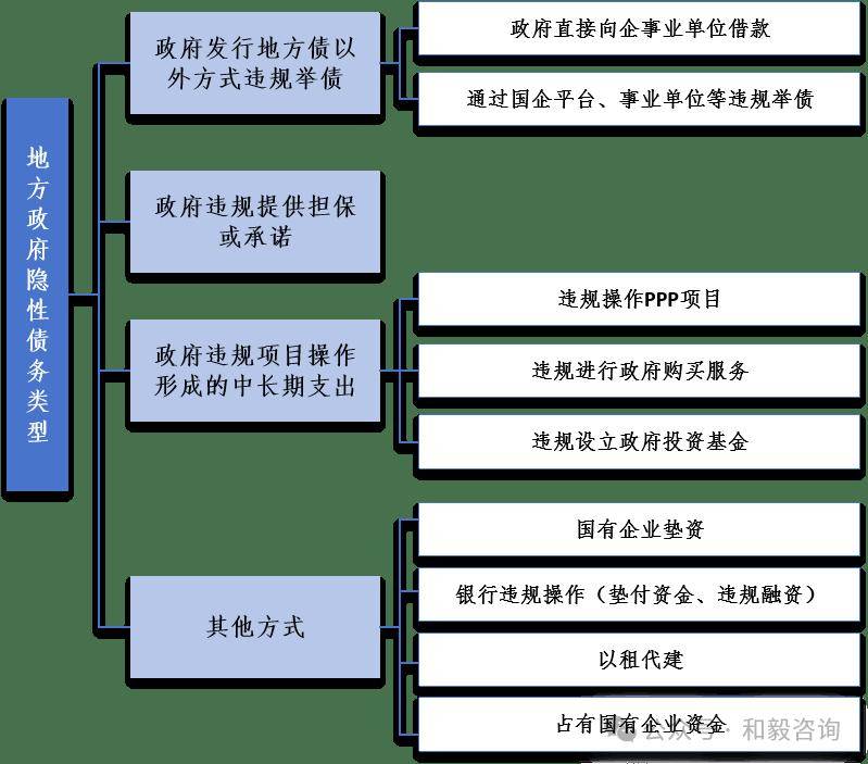 因此,地方政府(含政府部门和机构)以发行地方债以外的方式违规举债,并约定由财政资金偿还所产生的债务当然为隐性债务。常见类型包括政府直接向企事业单位借款;通过国企平台、事业单位等募集资金举债融资等。