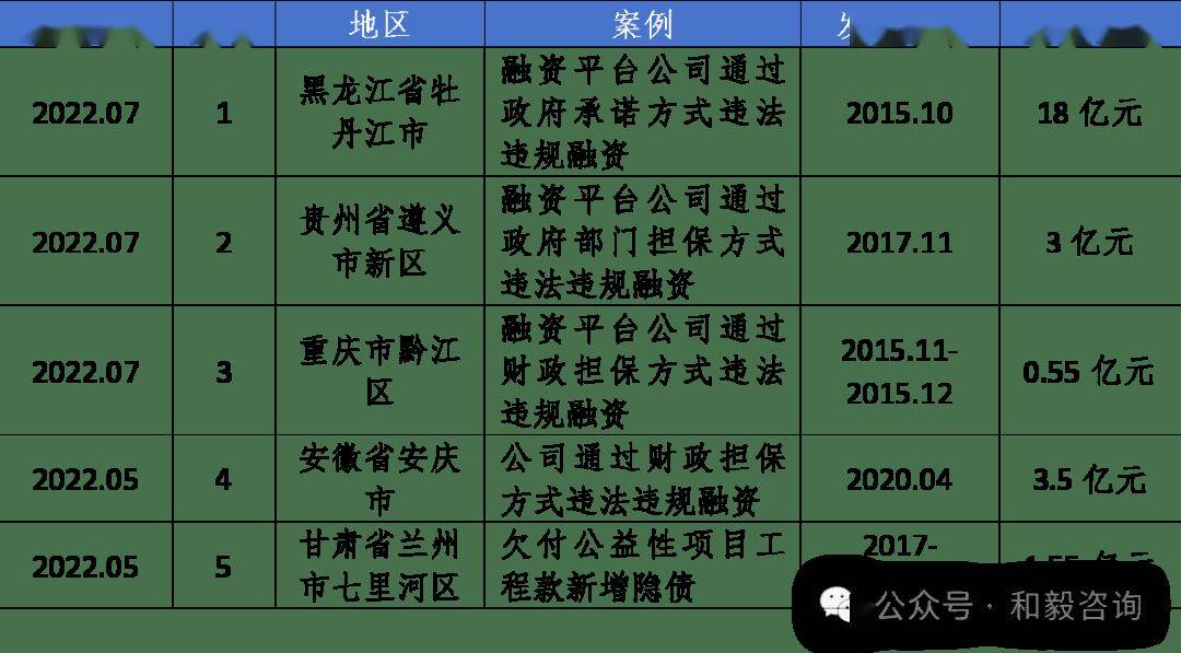 2022年7月通报的重庆市黔江区案例,重庆市黔江区以提供承诺函方式违法违规融资。2015年11月至12月,黔江区人民政府批复同意重庆市黔江区城市建设投资(集团)有限公司向贵州中黔金科产业投资有限公司融资0.55亿元。黔江区财政局为该笔融资提供了协调资金支付融资产品本息的承诺函,造成新增隐性债务,时任该公司董事长张某某等相关责任人被问责。