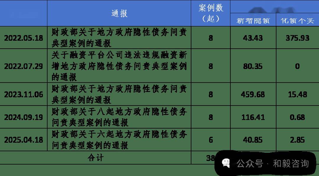 2025年4月通报的云南省昆明市富民县案例属于通过国有企业垫资形成新增隐性债务。2014年3月,县属国有企业云南富民产业发展投资集团有限公司自筹资金建设用于行政办公的黎阳大厦。黎阳大厦总投资共计1.89亿元。截至2022年底,富民县政府支付0.2亿元,企业垫付资金1.69亿元,形成新增隐性债务1.69亿元。时任富民县委书记、县长等相关责任人被问责。