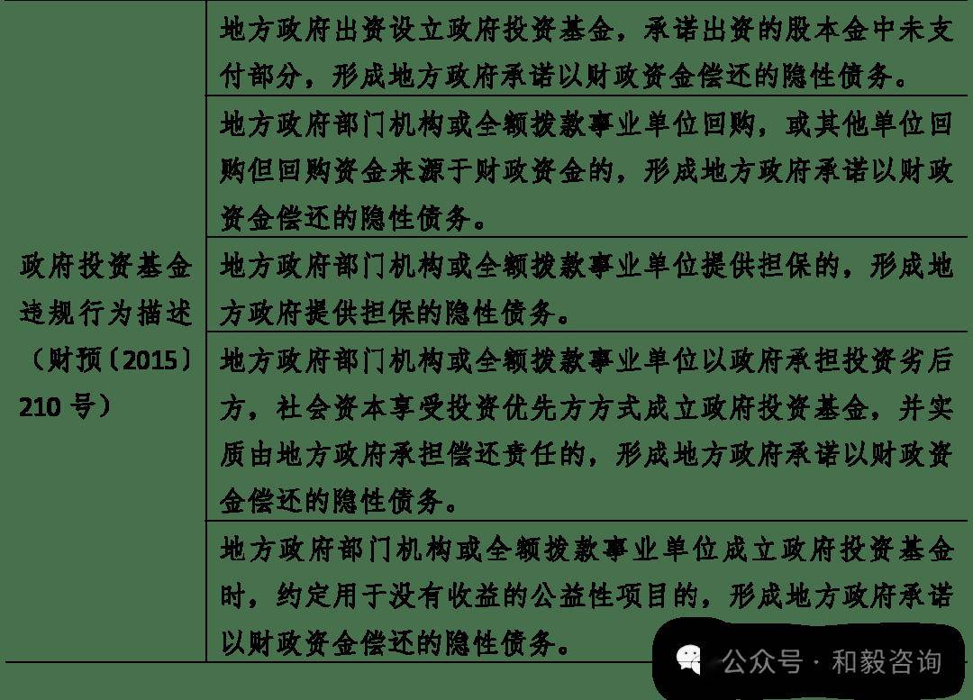 实际中,除了因违规操作PPP项目和违规进行政府购买服务导致的新增隐性债务外,地方政府往往会由于不规范或违规设立政府投资基金,形成新增的政府隐性债务,如地方政府向其他出资人承诺投资本金不受损失,或向其他出资人承诺最低收益;以借贷资金出资设立政府投资基金等。