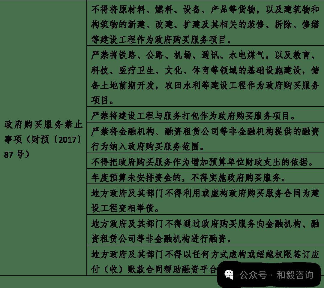 为规范政府购买服务管理,制止地方政府违法违规举债融资行为,2017年5月,财政部《关于坚决制止地方以政府购买服务名义违法违规融资的通知》(财预〔2017〕87号),对政府购买服务作出相应规范。凡属于文件中规定禁止情况的计入地方政府隐性债务,并且还需综合考虑还款资金来源是否为财政资金、地方政府部门机构或全额拨款事业单位是否提供担保等属性,综合判断债务类型。