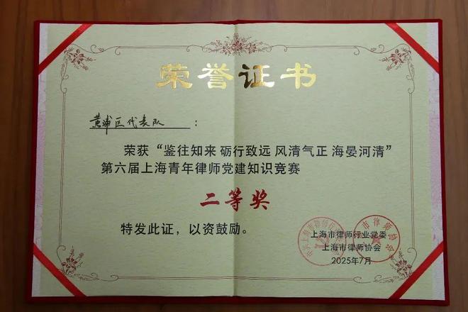 7月25日下午,由共青团上海市委、上海市律师行业党委、上海市律师协会主办,市律师行业党委青年工作部、市律协青工委、党建委承办的第六届上海青年律师党建知识竞赛总决赛,在上海市司法局圆满落幕。黄浦律师代表队在线下总决赛中,以总分第二的成绩喜获二等奖!